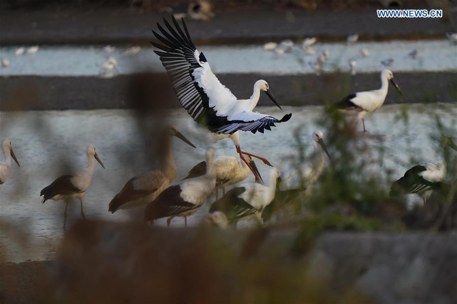 A flock of oriental white storks forage during their southward migration at Caofeidian wetland in Tangshan, north China's Hebei Province, Nov. 3, 2020. (Xinhua/Yang Shiyao)