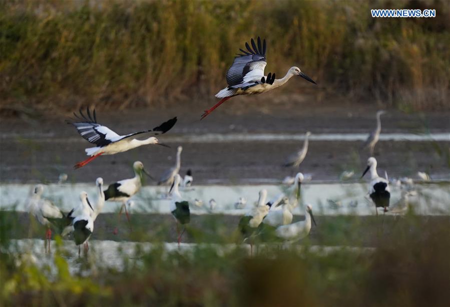 A flock of oriental white storks forage during their southward migration at Caofeidian wetland in Tangshan, north China's Hebei Province, Nov. 3, 2020. (Xinhua/Yang Shiyao)