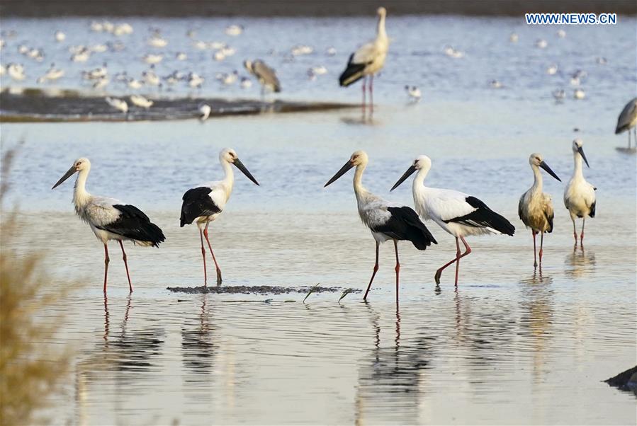 A flock of oriental white storks forage during their southward migration at Caofeidian wetland in Tangshan, north China's Hebei Province, Nov. 3, 2020. (Xinhua/Yang Shiyao)