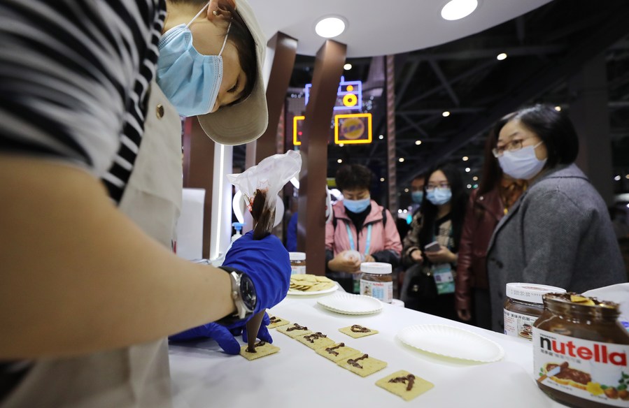Visitors watch a staff member making chocolate dessert at the booth of Ferrero Rocher at the Food and Agricultural Products exhibition area during the third China International Import Expo (CIIE) in Shanghai, east China, Nov. 5, 2020. (Xinhua/Fang Zhe)