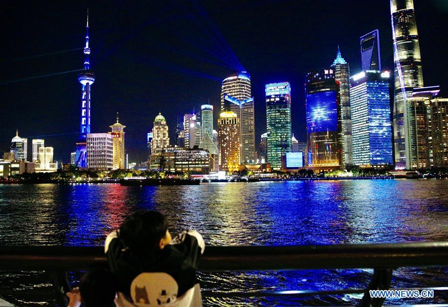 A child views a light show at the Bund in Shanghai, east China, Nov. 4, 2020. A light show themed on the China International Import Expo (CIIE) was held in Lujiazui of Shanghai on Wednesday. (Xinhua/Zhang Yuwei)