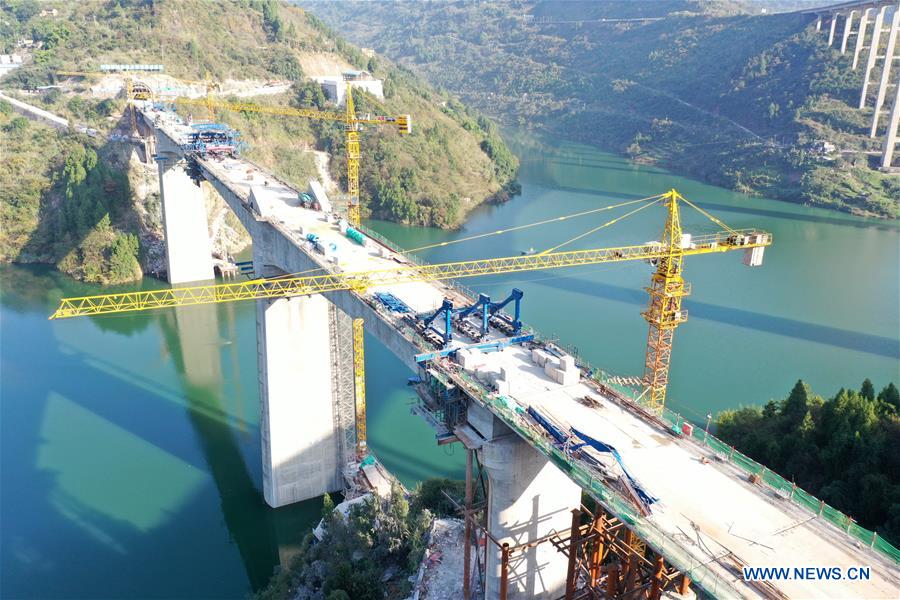 Photo taken on Nov. 8, 2020 shows the construction site of a highspeed railway bridge over Tangxi River in Yunyang Township in southwest China's Chongqing. The 472.7-meter-long bridge, which finished its final stage for closure on Nov. 8, is part of the 818-kilometer-long highspeed railway linking Zhengzhou, provincial capital of Henan, with Wanzhou District of Chongqing. (Xinhua/Tang Yi)