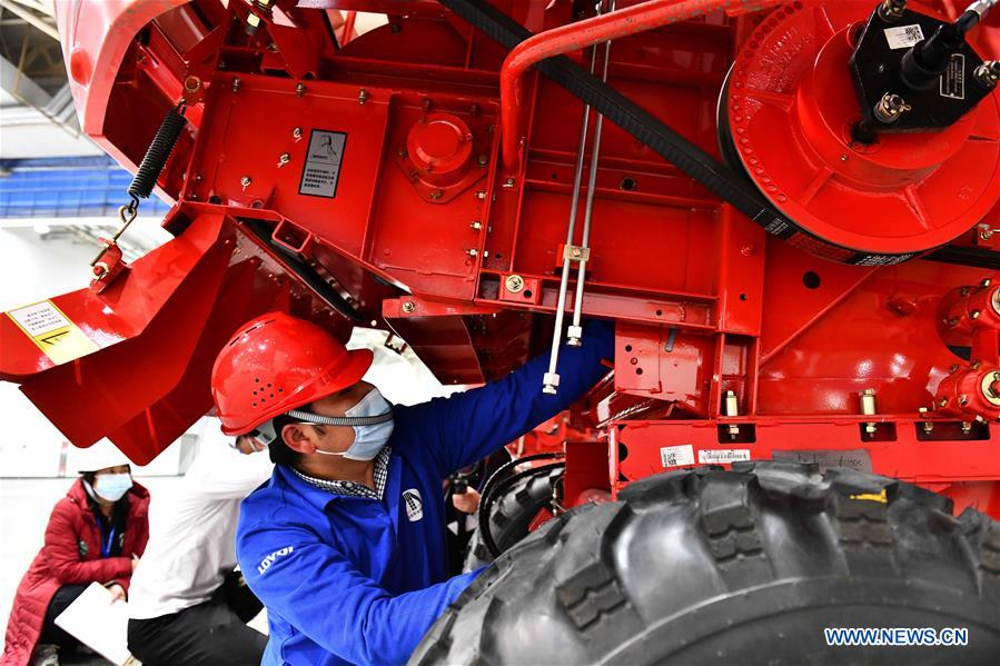 A contestant takes part in a combine harvester general troubleshooting event during a national vocational skills competition for agricultural practitioners at a convention and exhibition center in Weifang, east China's Shandong Province, Nov. 9, 2020. (Xinhua/Guo Xulei)