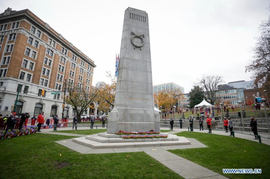 Representatives of Canadian Armed Forces stand around the cenotaph with physical distance during the Remembrance Day ceremony at Victory Square in Vancouver, British Columbia, Canada, Nov. 11, 2020. Due to the COVID-19 pandemic, this year's Remembrance Day was held under health safety measures. The Victory Square was closed to the public and only allowed limited number of attendees to participate in the ceremony. (Photo by Liang Sen/Xinhua)