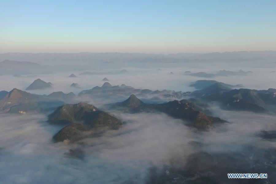 Aerial photo taken on Nov. 13, 2020 shows sea of clouds at Biancheng Township of Huayuan County, Xiangxi Tujia and Miao Autonomous Prefecture, central China's Hunan Province. (Xinhua/Xue Yuge)