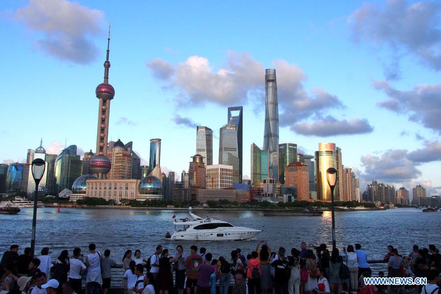 People enjoy the view of Lujiazui at the Bund in east China's Shanghai, Aug. 2, 2019. This year marks the 30th anniversary of China's announcement that it would develop and open up Shanghai's Pudong, which epitomizes China's continuous efforts to deepen reforms and open its doors to the world.