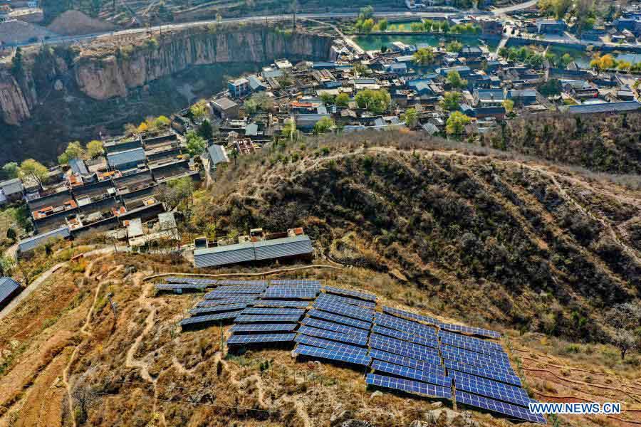 Aerial photo taken on Nov. 11, 2020 shows photovoltaic power generators in Hongni Village in Pingshun County, north China's Shanxi Province.