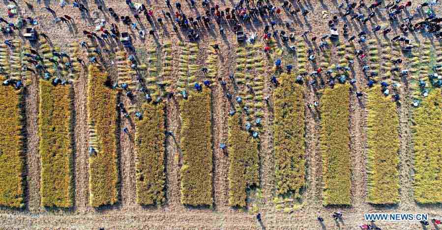 Aerial photo taken on Nov. 15, 2020 shows the skills competition for autumn harvest on rice paddies at Chunhua Village of Fuchun Neighborhood in Fuyang District of Hangzhou, east China's Zhejiang Province. A total of 24 groups from each village of Fuchun Neighborhood participated in the competition here Sunday. Participants need to compete in skills as cut rice, thresh rice, put rice into sacks and bind the straw. (Xinhua/Xu Yu)