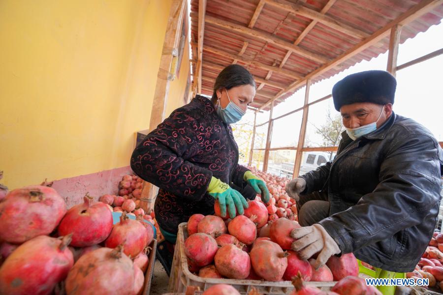 Villagers arrange harvested pomegranates in Piyalma Township of Pishan County in Hotan Prefecture, northwest China's Xinjiang Uygur Autonomous Region, Nov. 21, 2020. In the past three decades, the per capita net income of local people has surged from less than 300 yuan (about 45.6 U.S. dollars) in the 1990s to 16,495 yuan (about 2,503.9 U.S. dollars) in 2019 thanks to the development of pomegranate planting that covers an area of over 24,000 mu (1,600 hectares) in Piyalma Township. (Xinhua/Zhao Ge)