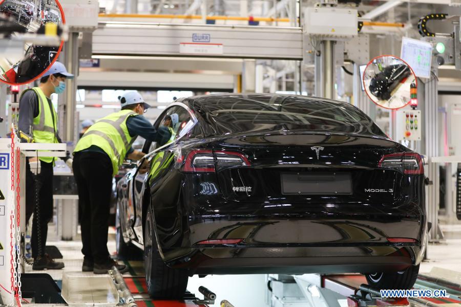 Employees work at the Tesla Gigafactory in Shanghai, east China, Nov. 20, 2020. U.S. electric car company Tesla in 2019 built its first Gigafactory outside the United States in the new Lingang area, with a designed annual production capacity of 500,000 units. The Tesla Shanghai Gigafactory broke ground in early 2019 and delivered its first batch of made-in-China Model 3 sedans one year later. With the second-phase project of its gigafactory under construction, Tesla expects to start the mass production of made-in-China Model Y vehicles in the first half of 2021. (Xinhua/Ding Ting)