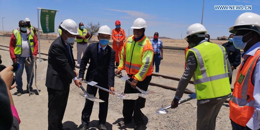 Officials from Namibian Ministry of Works and Transport and China Gezhouba Group Corporation in Namibia break ground for the project of the rehabilitation and upgrading of the railway line between Walvis Bay and Arandis in Arandis, western Namibia, on Nov. 30, 2020. The Namibian government's plan to develop the country into a transport and logistics hub in southern Africa helped by the groundbreaking of the rehabilitation and upgrading of the railway line between Walvis Bay and Arandis on Monday. The project will be undertaken by China Gezhouba Group Corporation (CGGC) in Namibia and the development is set to enhance 70 percent of the railway network, and make the railway transportation meet the railway transport capacity of the Southern African Development Community (SADC). (Photo by Sun Yumo/Xinhua)
