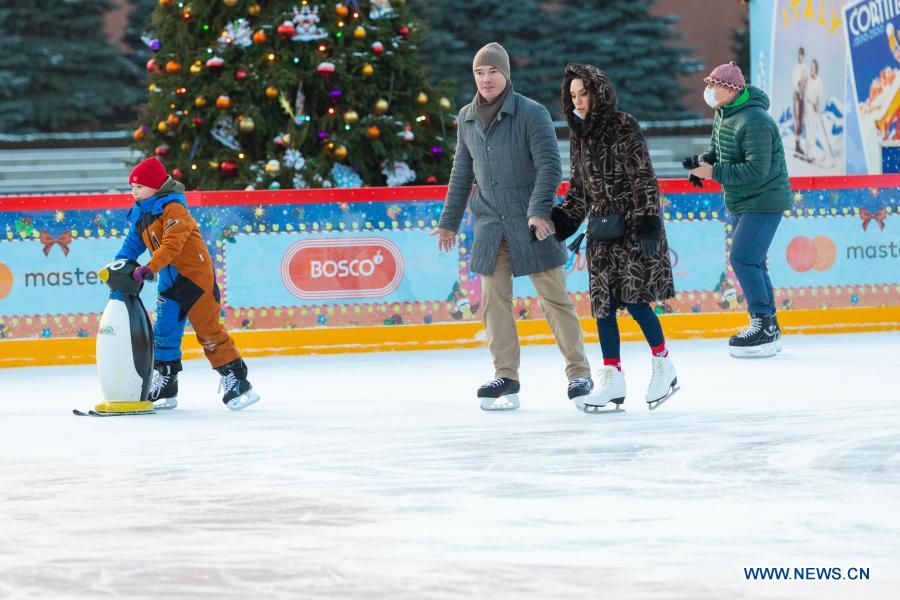 People skate on the GUM ice rink at Red Square in Moscow, Russia, on Dec. 2, 2020. The rink at Red Square will be open to public until March 1, 2020. (Xinhua/Bai Xueqi)