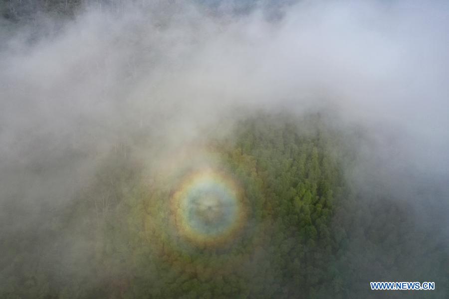 Aerial photo taken on Dec. 2, 2020 shows a cloud scenery at Wuyishan National Park, southeast China's Fujian Province. Wuyishan National Park is one of the country's 10 pilot national parks, with 210.7 square kilometers primary forest vegetation preserved here. (Xinhua/Jiang Kehong)