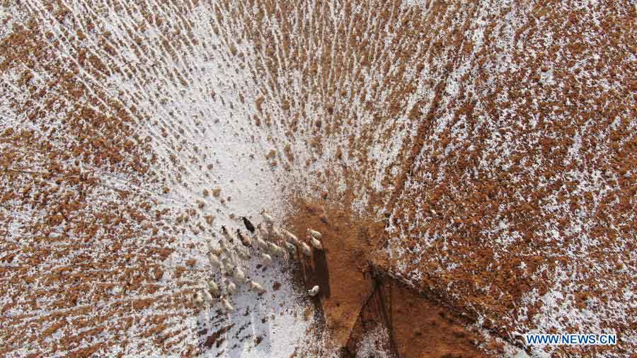 Aerial photo taken on Dec. 6, 2020 shows flock of sheep walking on the Arou grassland after snow in Arou Township of Qilian County, northwest China's Qinghai Province. (Xinhua/Zhang Hongxiang)
