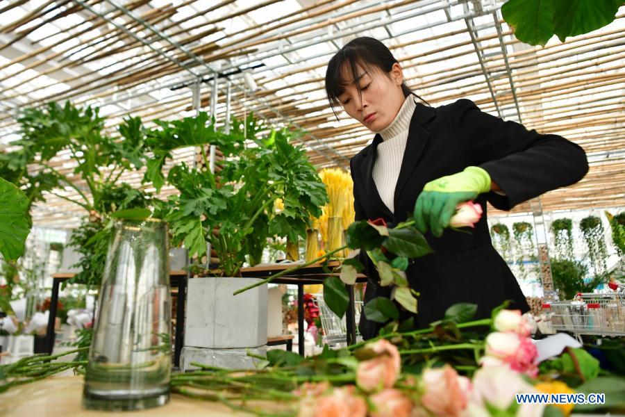 An employee works at a flower trade center in Lanzhou New Area, Lanzhou, northwest China's Gansu Province, Dec. 8, 2020. In recent years, through soilless culture, automatic intelligent control, harmless treatment of manure and other technological means, a modern circular agriculture system has been formed in Lanzhou New Area to realize green development and boost the income of local villagers. (Xinhua/Chen Bin)