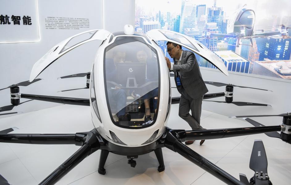 Visitors learn about an autonomous aircraft on display at an exhibition during the "China 5G + Industrial Internet Conference" in Wuhan, central China's Hubei Province, Nov. 19, 2020. (Xinhua/Cheng Min)