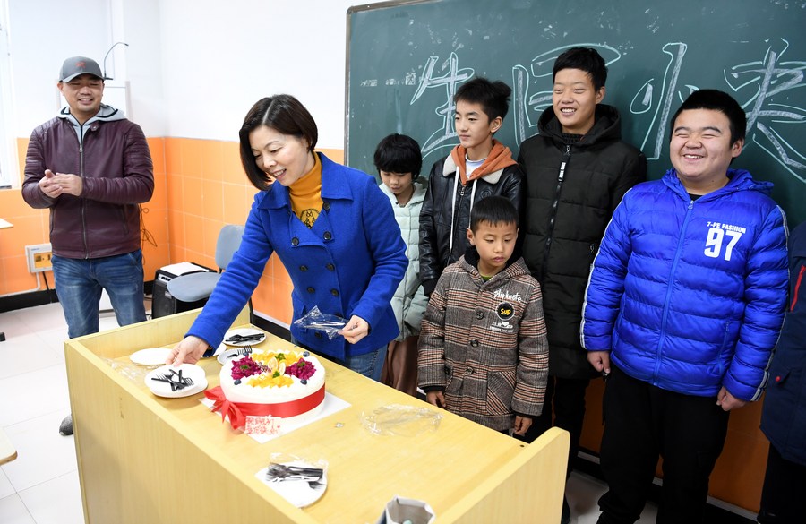 A teacher celebrates birthday for students at a special school in Wuhu City, east China's Anhui Province, Nov. 26, 2020. (Xinhua/Zhang Duan)