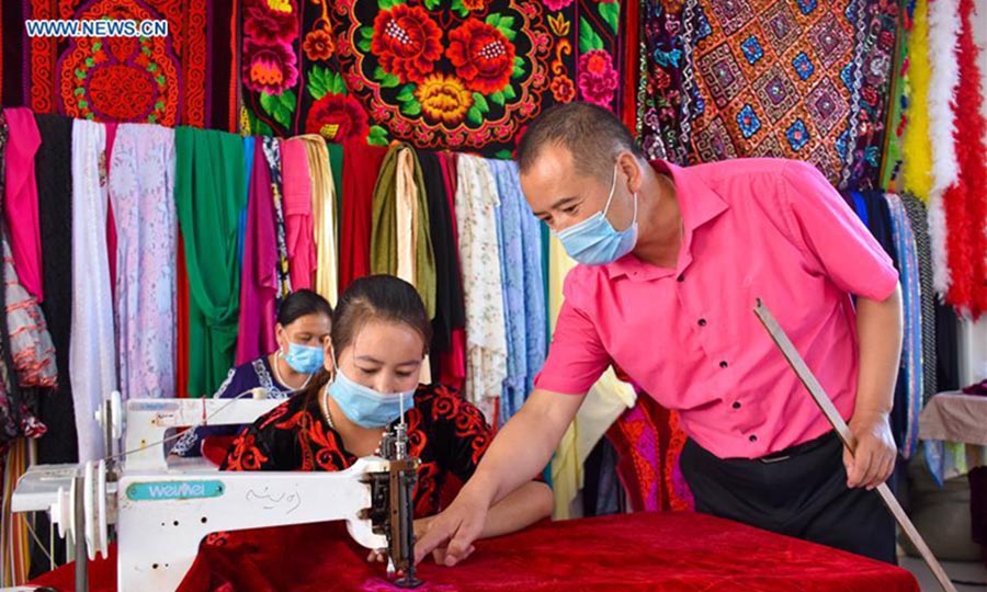 A man guides a staff member in embroidery works at a handicraft making cooperative in Aketao County of northwest China's Xinjiang Uygur Autonomous Region, Sept. 20, 2020. Over 6,000 residents have relocated to the relocation settlements in Aketao County from less hospitable areas in the deep Kunlun Mountain. In response to the employment of relocated residents, local authorities have put great efforts into developing the traditional handicraft industry, as a way to support the poverty alleviation efforts. (Xinhua/Gao Han)
