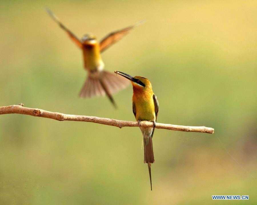 Photo taken on Dec. 3, 2020 shows a bird eating a bee on a branch at the Margalla Hills national park in Islamabad, capital of Pakistan. (Photo by Pharahnaz Naveed/Xinhua)