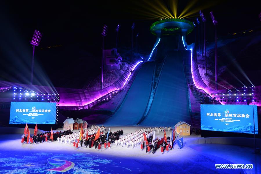 Photo taken on Dec. 21, 2020 shows participants attending the opening ceremony of the second winter sports event of Hebei Province at the National Ski Jumping Center in Chongli District of Zhangjiakou City, north China's Hebei Province. (Xinhua/Jin Haoyuan)