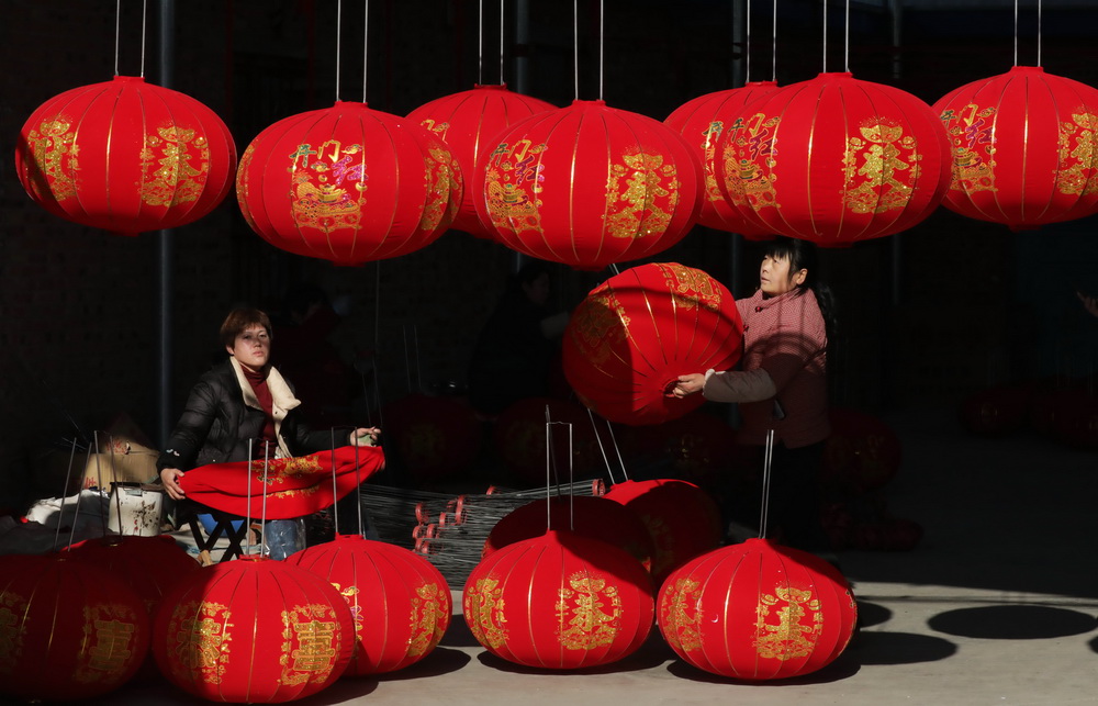 Two women work at a lantern factory in Shijing Village in Wuzhi County, central China's Henan Province, Dec. 21, 2020. Villagers are busy making lanterns for the upcoming festival season. (Photo by Feng Xiaomin/Xinhua)