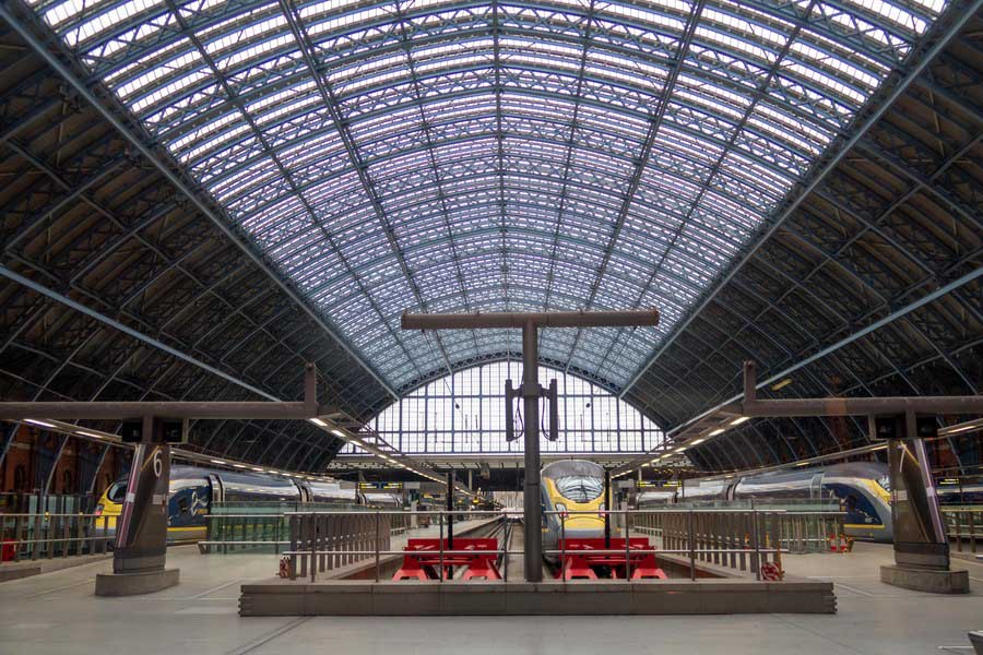 Photo taken on Dec. 21, 2020 shows Eurostar trains at empty St. Pancras International Station in London, Britain. Eurostar announced it was canceling trains between London, Brussels and Amsterdam from Dec. 21. (Photo by Tim Ireland/Xinhua)