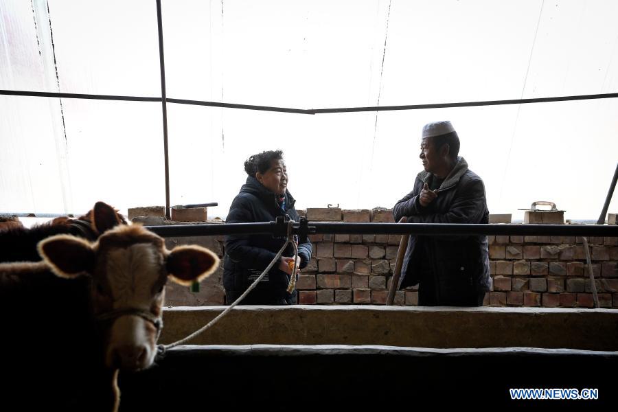 Ding Haiyan (R) visits Yang Youquan''s family, once an officially registered household in poverty, to learn about their livestock breeding situation in Hejiayuan Village of Xihaigu in northwest China''s Ningxia Hui Autonomous Region, Oct. 28, 2020. Xihaigu, a largely mountainous region in northwest Ningxia, was once inflicted by deep poverty and labeled the "most unfit place for human settlement" by the United Nations in the 1970s due to land reclamation, drought, and a fragile ecological environment. On Nov. 16, 2020, Xihaigu historically bid farewell to absolute poverty, during which "she power" played an indispensable role. Ding Haiyan, 55, is chairwoman of the trade union of water supplies bureau of Wuzhong City in Ningxia. She transferred to Hejiayuan Village in Yuwang Township of draught-haunted county of Tongxin in central Ningxia in 2015 starting her new career as a poverty alleviation cadre. To Ding''s great disappointment, most villagers there were seniors or the disabled who had no access to paved roads and electric power for industrial purposes, and little confidence in her will and power. Despite these, Ding insisted on making door-to-door visits to get her head around the basic situation there. She came up with a two-pillar strategy to simultaneously improve villagers'' income and infrastructure in the village. She also tailored individual poverty-alleviation plans for each household in the village. Started with livestock breeding, villagers had more and more confidence in Ding as they saw steadily increasing income. Ding also managed to multiply the villagers'' sources of income by encouraging production of specialty grains like millet and buckwheat. Thanks to her efforts, a paved road was also accomplished to bring output of the village to wider markets. Looking at an almost ready canteen for senior citizens, the last one of her promises to the villagers in Hejiayuan, Ding admitted that she occasionally shed tears due to the difficulties she had to confront, but she would never forget the villagers'' eyes with expectation and her responsibility for them. (Xinhua/Yang Zhisen)