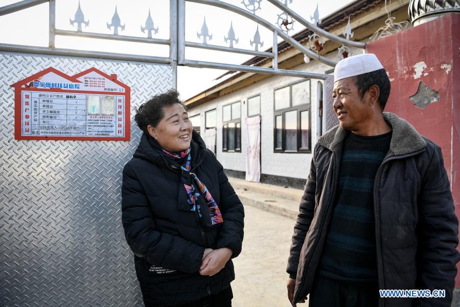 Ding Haiyan (L) visits Yang Youquan''s family, once an officially registered household in poverty, in Hejiayuan Village of Xihaigu in northwest China''s Ningxia Hui Autonomous Region, Oct. 28, 2020. Xihaigu, a largely mountainous region in northwest Ningxia, was once inflicted by deep poverty and labeled the "most unfit place for human settlement" by the United Nations in the 1970s due to land reclamation, drought, and a fragile ecological environment. On Nov. 16, 2020, Xihaigu historically bid farewell to absolute poverty, during which "she power" played an indispensable role. Ding Haiyan, 55, is chairwoman of the trade union of water supplies bureau of Wuzhong City in Ningxia. She transferred to Hejiayuan Village in Yuwang Township of draught-haunted county of Tongxin in central Ningxia in 2015 starting her new career as a poverty alleviation cadre. To Ding''s great disappointment, most villagers there were seniors or the disabled who had no access to paved roads and electric power for industrial purposes, and little confidence in her will and power. Despite these, Ding insisted on making door-to-door visits to get her head around the basic situation there. She came up with a two-pillar strategy to simultaneously improve villagers'' income and infrastructure in the village. She also tailored individual poverty-alleviation plans for each household in the village. Started with livestock breeding, villagers had more and more confidence in Ding as they saw steadily increasing income. Ding also managed to multiply the villagers'' sources of income by encouraging production of specialty grains like millet and buckwheat. Thanks to her efforts, a paved road was also accomplished to bring output of the village to wider markets. Looking at an almost ready canteen for senior citizens, the last one of her promises to the villagers in Hejiayuan, Ding admitted that she occasionally shed tears due to the difficulties she had to confront, but she would never forget the villagers'' eyes with expectation and her responsibility for them. (Xinhua/Yang Zhisen)