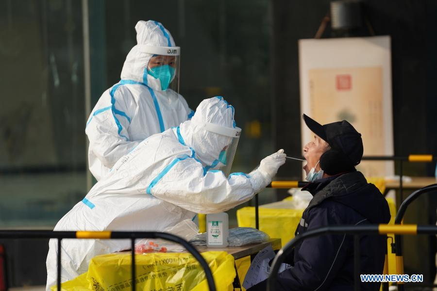 A medical worker collects samples from a man to conduct nucleic acid test at a sampling site in Chaoyang District of Beijing, China, Dec 26, 2020. [Photo/Xinhua]