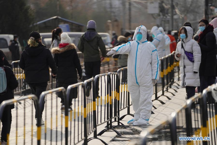 A medical worker guides people queue up for nucleic acid tests at a sampling site in Chaoyang District of Beijing, China, Dec 26, 2020. Beijing reported two new locally transmitted confirmed COVID-19 cases on Friday, local health authorities said Saturday. [Photo/Xinhua]
