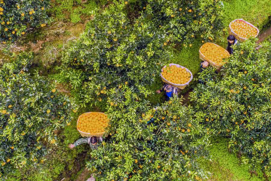 Aerial photo shows farmers harvesting navel oranges at an orange plantation in Leigutai Village of Guojiaba Township in Zigui County, central China's Hubei Province, Dec. 4, 2020. (Xinhua/Wang Gang)