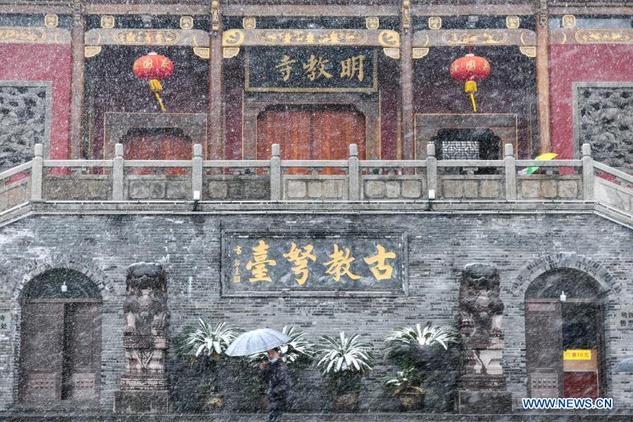 A man walks in snow in Hefei City of east China's Anhui Province, Dec. 29, 2020. China's meteorological authority on Tuesday renewed an orange alert, the second highest in a four-tier warning system, for a cold wave as a strong cold front has been sweeping across most parts of central and east China from Monday. (Xinhua/Han Xu)