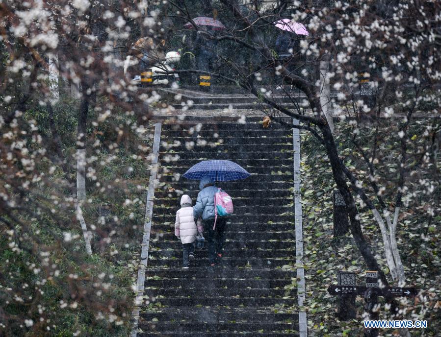 Visitors tour a park in snow in Hefei City of east China's Anhui Province, Dec. 29, 2020. China's meteorological authority on Tuesday renewed an orange alert, the second highest in a four-tier warning system, for a cold wave as a strong cold front has been sweeping across most parts of central and east China from Monday. (Xinhua/Han Xu)