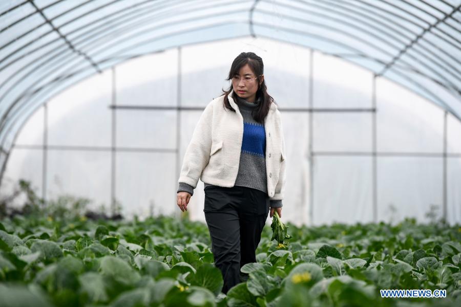 Feng Yahong checks the growth of vegetables at a greenhouse in Xiji County, northwest China's Ningxia Hui Autonomous Region, Oct. 29, 2020. Xihaigu, one of China's most impoverished areas located in Ningxia, saw its last impoverished county removed from the national poverty list on Nov. 16, 2020. The victory is another landmark in China's campaign to eradicate absolute poverty, during which "she power" played an indispensable role. Feng Yahong, a 33-year-old rural woman living in the areas, has helped many local women get rid of poverty through leading them in planting vegetables. She used to be a vegetable peddler. For pursuing a better life, in 2009, she tried to rent some greenhouses to start her vegetable planting business. In Xihaigu, most men worked away from home to earn money to support families but women were left behind to take care of family members. Feng hired many local rural women as vegetable growers. In 2012, they jointly started a vegetable planting cooperative. At the beginning of the business, Feng suffered lots of setbacks, such as a failure of producing qualified vegetables and a fire in the greenhouses. Those failures nearly led her into despair because she had used up all her money and even couldn't pay the workers she hired. However, so as not to disappoint people who trusted in her, Feng pulled herself up soon and kept trying all kinds of ways to raise money for paying off debts. Fortunately, she managed to get a loan from the local Women's Federation so that she could restart her vegetable business. Learning from previous failures, Feng gradually made her business on a right track. Now, during busy farming seasons, there are over 300 employees working in her cooperative. As Feng's business grows, the wages of those women worker have dramatically increased, and the members of the cooperative can also get a bonus every year. (Xinhua/Feng Kaihua)