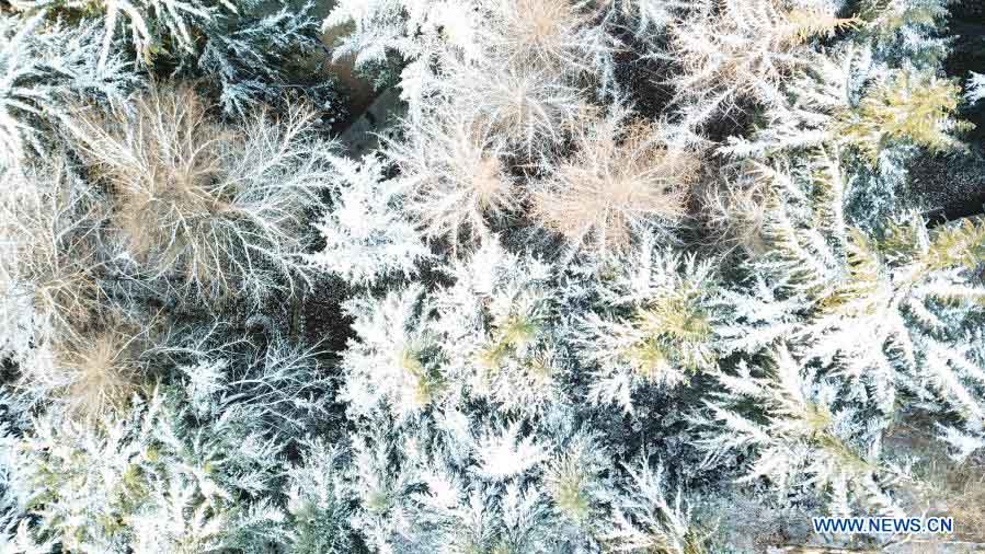 Aerial photo taken on Dec. 30, 2020 shows the snow view at Huancheng Park in Hefei, capital of east China's Anhui Province. (Xinhua/Zhang Duan)