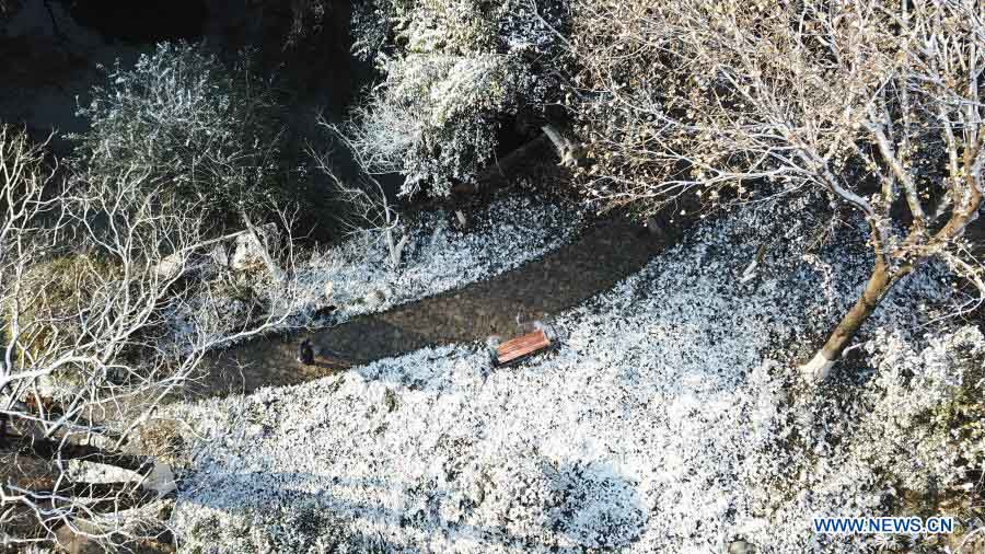 Aerial photo taken on Dec. 30, 2020 shows the snow view at Huancheng Park in Hefei, capital of east China's Anhui Province. (Xinhua/Zhang Duan)
