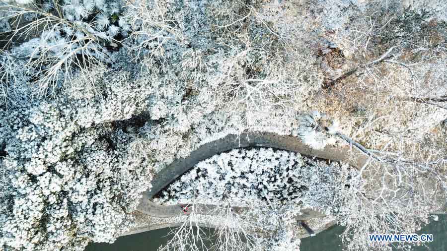 Aerial photo taken on Dec. 30, 2020 shows the snow view at Huancheng Park in Hefei, capital of east China's Anhui Province. (Xinhua/Zhang Duan)