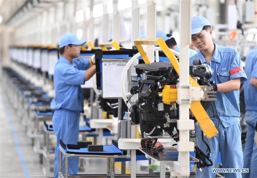 Workers assemble control system of instrument panel at a passenger car workshop of Ningde base of SAIC Motor Corporation Ltd in Ningde, East China's Fujian province, Sept 15, 2020. [Photo/Xinhua]