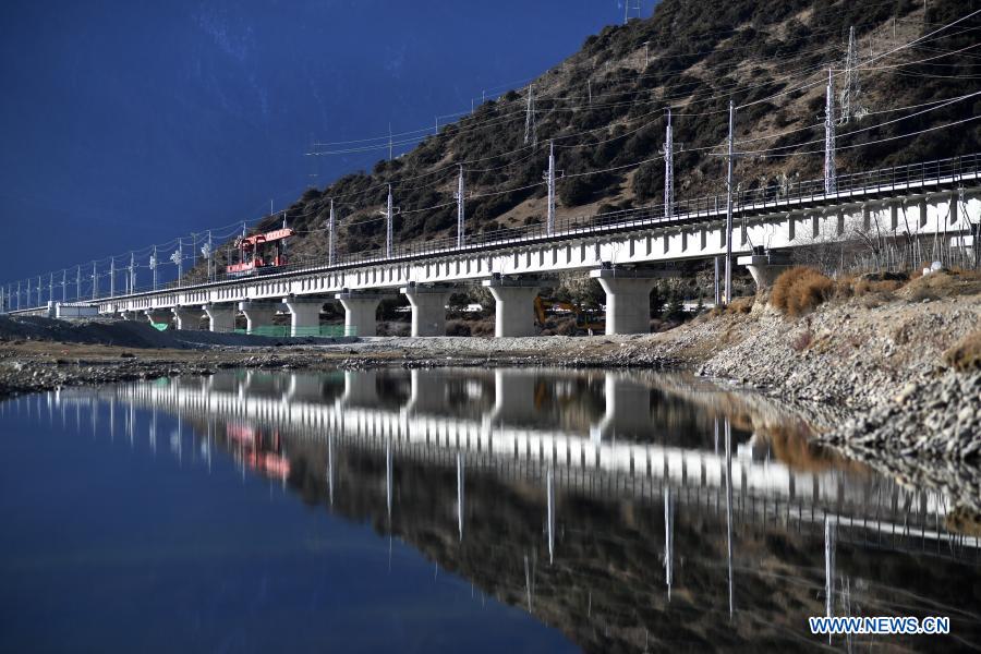 Photo taken on Dec. 28, 2020 shows the construction site of track-laying at a bridge of Lhasa-Nyingchi section of the Sichuan-Tibet Railway in southwest China's Tibet Autonomous Region. The track-laying work was completed on Thursday for a railway linking the cities of Lhasa and Nyingchi in southwest China's Tibet Autonomous Region. (Xinhua/Chogo)
