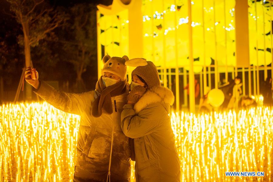 Tourists take a selfie at the Happy Valley Wuhan theme park in Wuhan, central China's Hubei Province, Jan. 1, 2021. People came to have fun and enjoy the view at the Happy Valley in Wuhan to greet the New Year on Friday. (Xinhua/Xiong Qi)