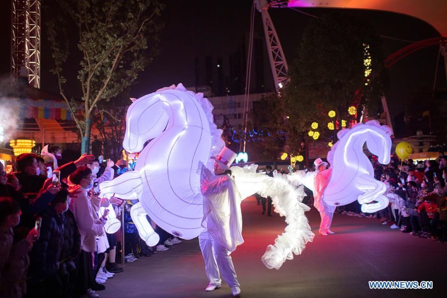 Performers interact with tourists at the Happy Valley Wuhan theme park in Wuhan, central China's Hubei Province, Jan. 1, 2021. People came to have fun and enjoy the view at the Happy Valley in Wuhan to greet the New Year on Friday. (Xinhua/Xiong Qi)