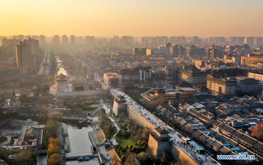 Aerial photo taken on Jan. 1, 2021 shows the sunset scenery in Xi'an, northwest China's Shaanxi Province. (Xinhua/Tao Ming)