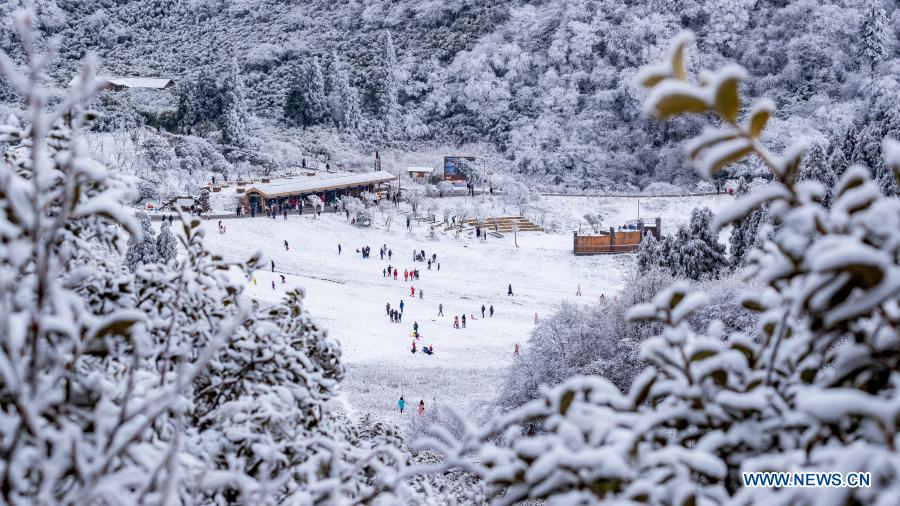People have fun in the snow covered Jinfo Mountain in Nanchuan District of southwest China's Chongqing, Jan. 1, 2021. (Photo by Qu Mingbin/Xinhua)