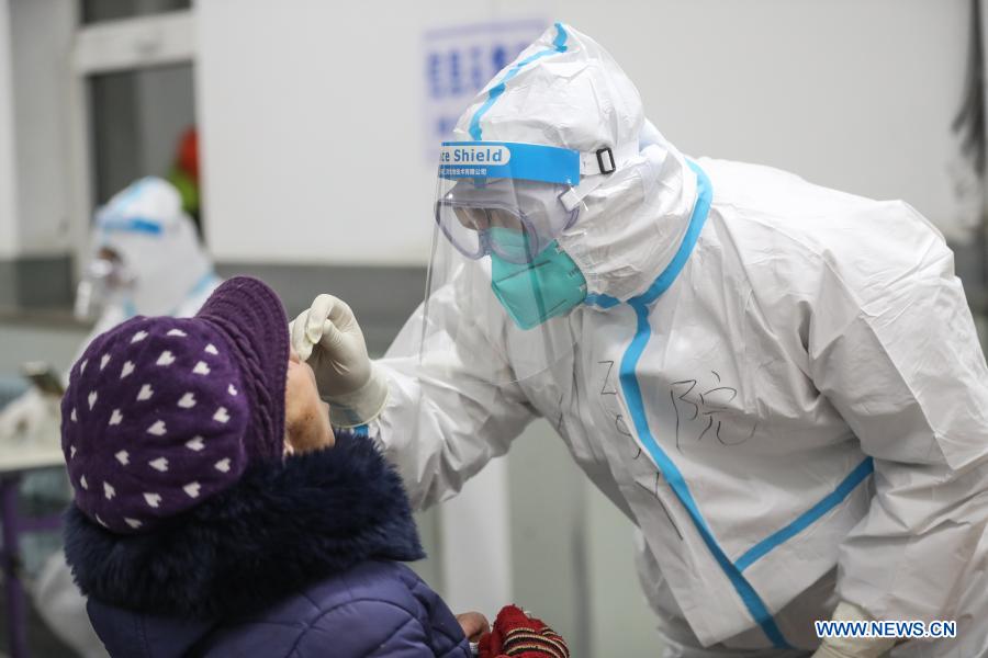A medical worker collects a swab sample from a resident at a coronavirus testing site in Tiexi District of Shenyang, northeast China's Liaoning Province, Jan. 4, 2021. Shenyang is conducting a second round of nucleic acid tests for all residents in Texi, Huanggu and Yuhong districts, starting Monday. (Xinhua/Pan Yulong)