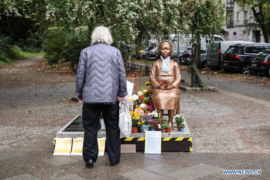 A pedestrian looks at a "comfort women" statue in Berlin, capital of Germany, Oct. 15, 2020. (Xinhua/Shan Yuqi)