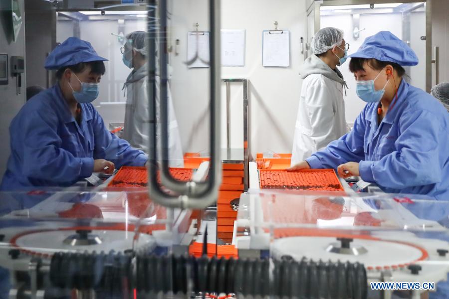 Staff members work at a COVID-19 vaccine packaging plant of Sinovac Research and Development Co., Ltd. in Beijing, capital of China, Jan. 6, 2021. The COVID-19 vaccine inoculation among specific groups of people with higher infection risks has started across China recently. Vaccine developing companies including Sinovac Research and Development Co., Ltd. are busy producing COVID-19 vaccines to ensure the inoculation being conducted orderly. (Xinhua/Zhang Yuwei)