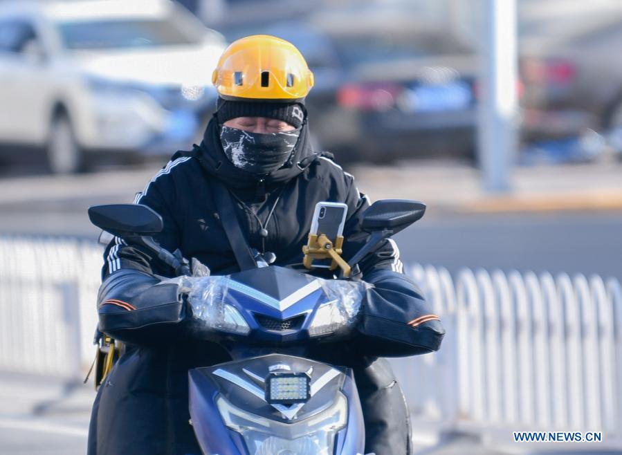 A deliveryman works at Hedong District in north China's Tianjin, Jan. 6, 2021. Many workers stick to their posts outdoors as the city experiences a strong cold wave that started on Wednesday. (Photo by Sun Fanyue/Xinhua)