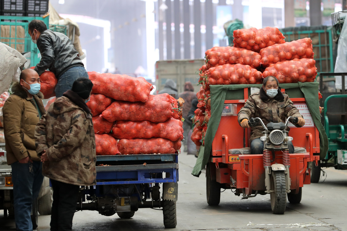 Vegetable dealers transport produce at a wholesale market in Shijiazhuang, Hebei province, on Monday. The market will guarantee an ample supply of vegetables and fruit despite the recent COVID-19 outbreak, officials said. Wang Zhuangfei/China Daily