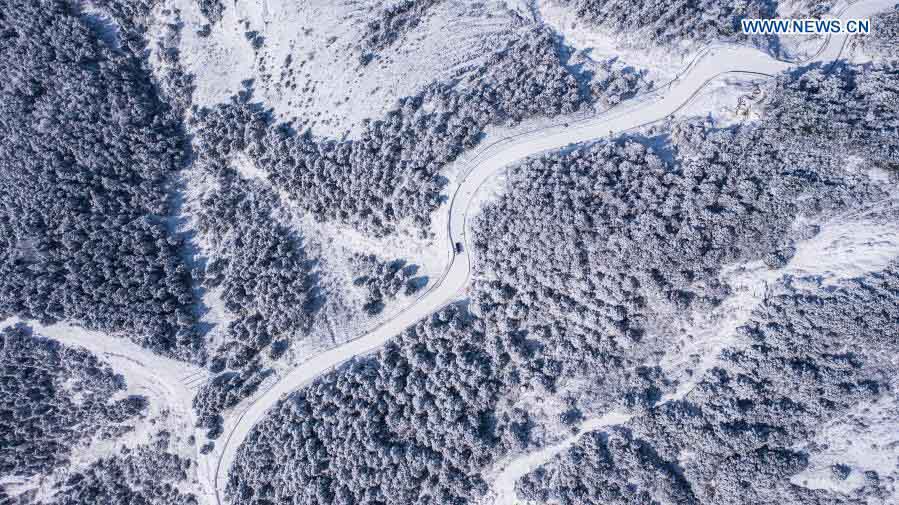 Aerial photo taken on Jan. 12, 2021 shows the snow scene in Pingdi of Panzhou in Liupanshui City, southwest China's Guizhou Province. (Xinhua/Tao Liang)