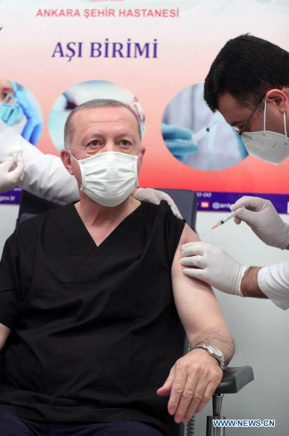 Turkish President Recep Tayyip Erdogan (L) receives a dose of COVID-19 vaccine at a hospital in Ankara, Turkey, on Jan. 14, 2021. Erdogan on Thursday received his first dose of vaccine as Turkey has started mass vaccination against COVID-19. (Xinhua)
